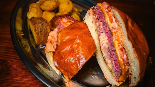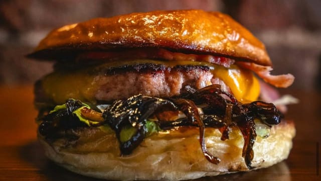 Vaca madurada, cheddar, bacon, ensalada, cebolla a la plancha, salsa BBQ