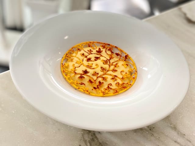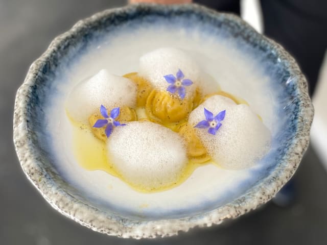 Farci de courge "azienda caliò", bleu du piémont et okara, air d'amande, beurre d'isigny A.O.P.