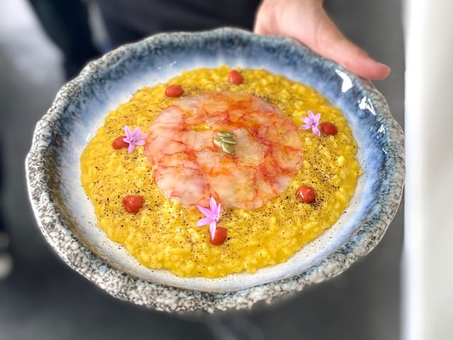 Vialone nano, courge violina, citron noir, gambas rouges crues et leur bisque
