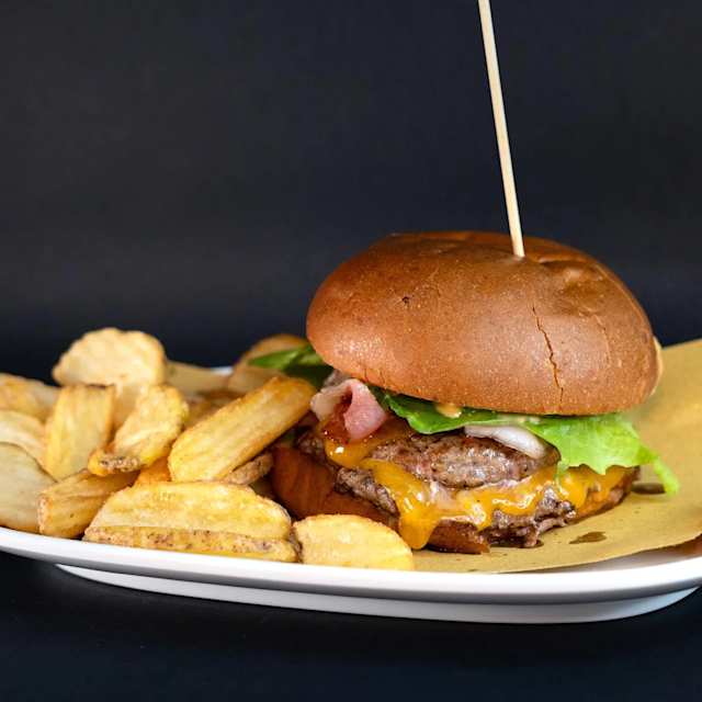 - Bun homemade, hamburger di manzo 180 g, bacon croccante, cheddar, cipolla caramellata, lattuga, salsa burger
