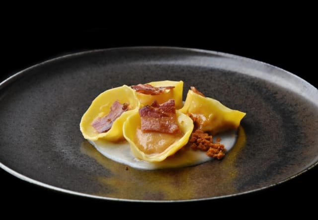 Ravioli di pappa al pomodoro alla crema di lardo di colonnata e croccante di guanciale