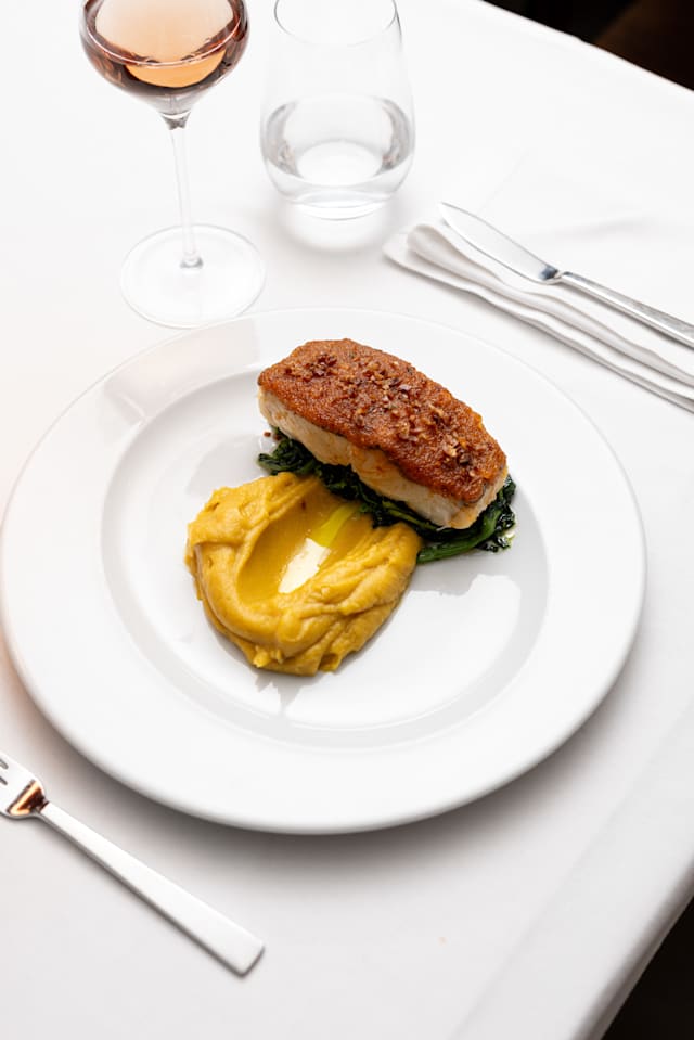 Bacalhau confitado com crosta de frutos secos, puré de batata roxa, couve e grão frito