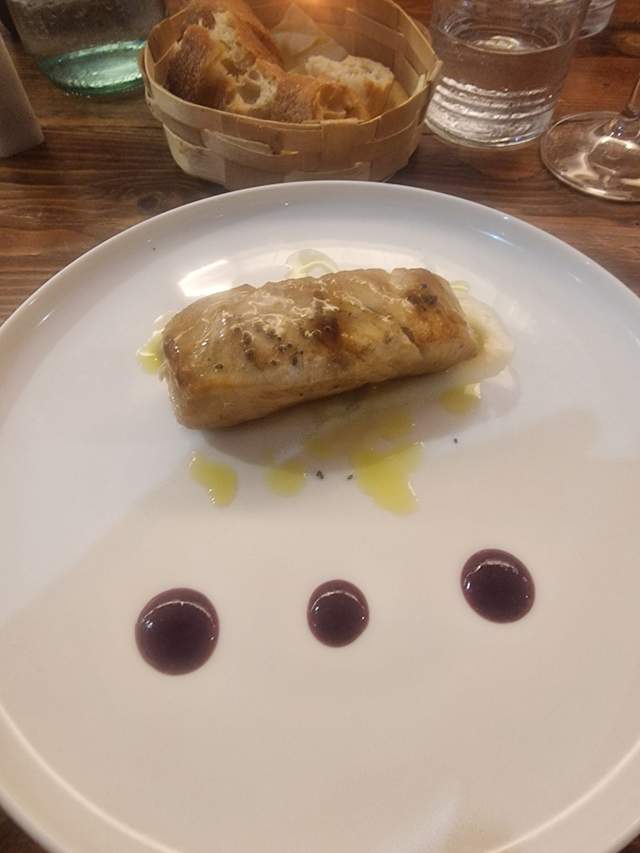- Nel suo fondo su crema di funghi porcini e salsa alle erbe e semi di papavero cipolla rossa di tropea marinata