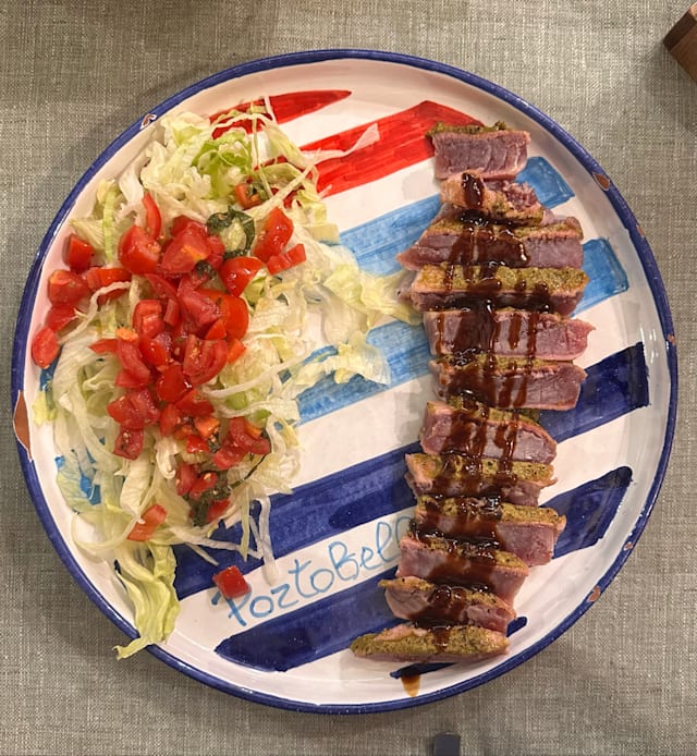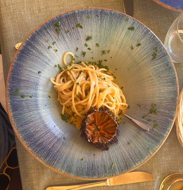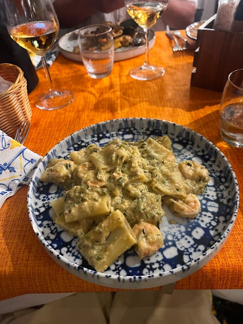 10/1010 out of 10. Service was wonderful by different staff members and had a lovely table for two outside. Without a doubt the meal was one to go down into the memory. Spectacular meal selection to make the choices challenging. Stared with a fresh salad with plenty of shelled shrimp, avocado and generous heavy shavings of parmigiana cheese. Lightly dressed. The pasta with sea urchin was fantastic and equally delicious was the tuna in a pistachio crust/pesto and so lightly was a drizzle of a semi sweet “bbq” sauce that added another layer of extra flavor. WOW so decadent. Going back to try out other things on the menu tomorrow 😋😋👏👏👏