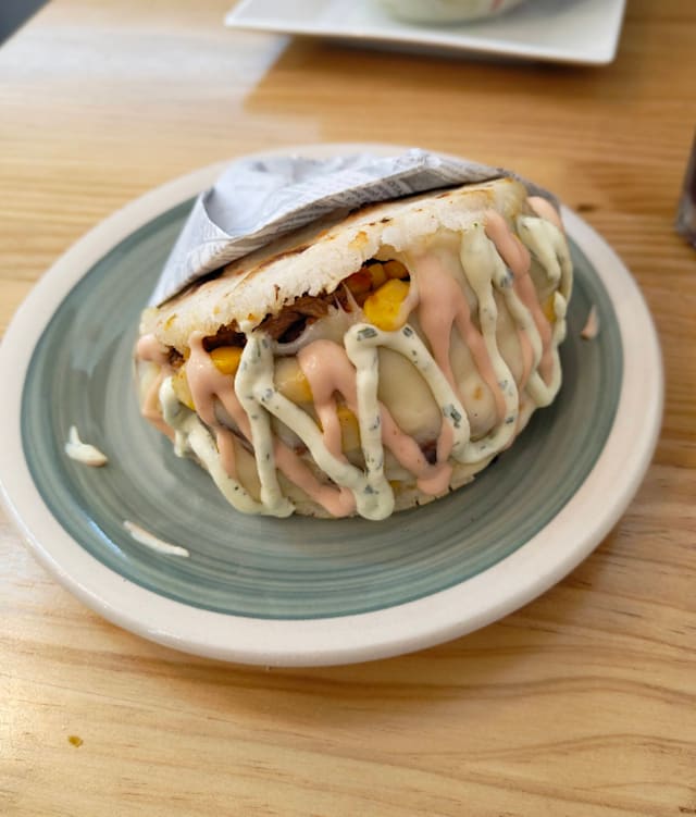 - Maicitos acompañados de la salsa de la casa y abundante queso mozarella, pollo mechado y bacon