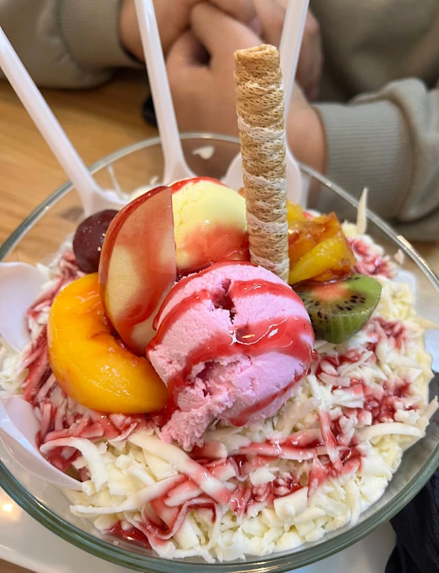 - 1 Bola de helado acompañado de fresa, melocotón, kiwi, plátano, queso y nata montada