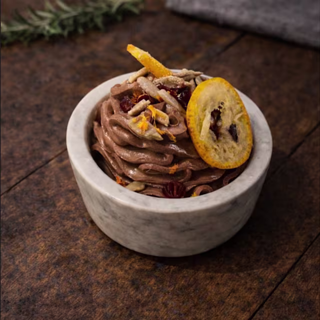 - A chocolate ganache paired with tart raspberry coulis.