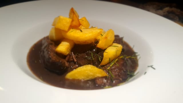 Carrillera de cerdo en salsa de Vino Tinto Con pure de patata casero