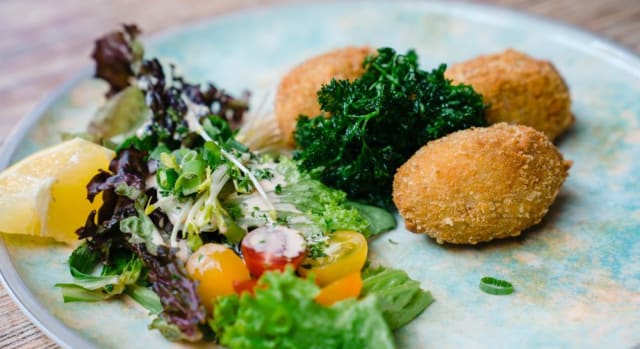3 in huis gemaakte garnaalkroketten met sla en frietjes