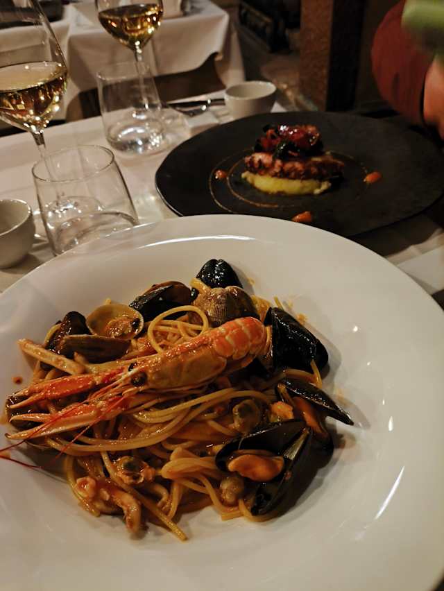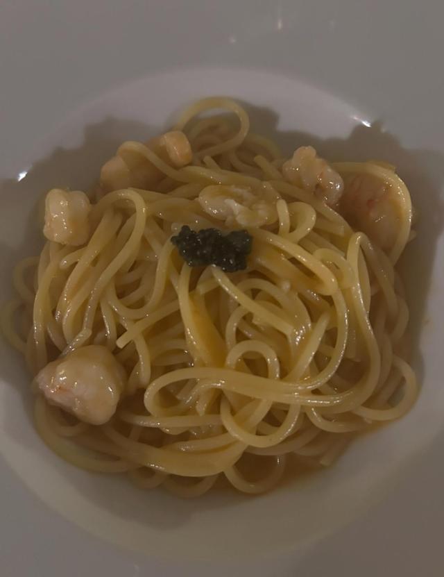 - Spaghetti con scampi, fondo di crostacei, zest di limone e caviale
