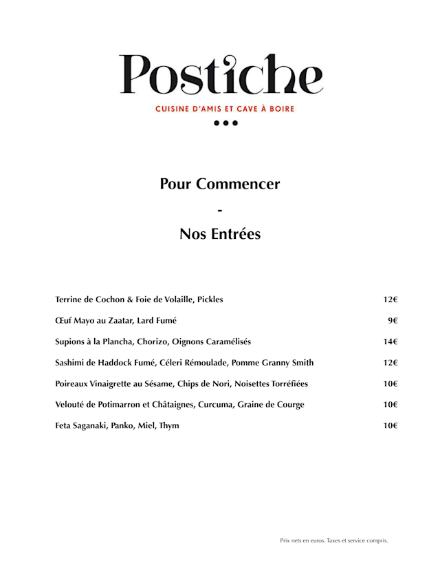 9/10We have eaten at Postiche three times, and it is consistently a pleasure. Service is friendly and efficient, the food very good and the place charming and relaxed.
