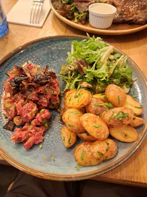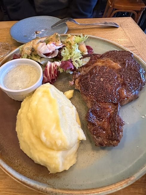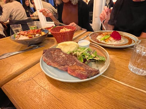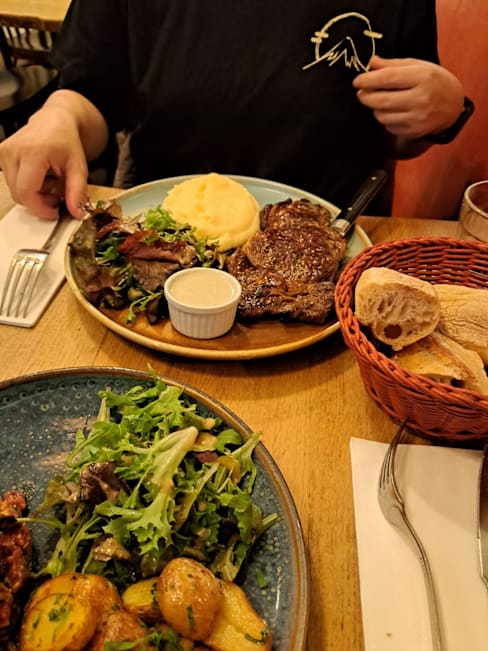 7/10Nice location, but the rib eye steak was not good, I left most of it as it was too chewy and over cooked. I think it was €36 which is a lot for a poor steak
