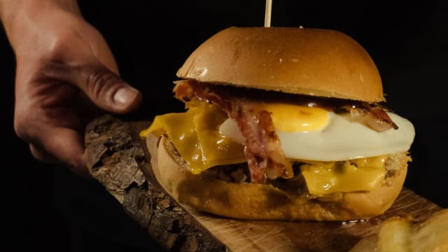 Doppio hamburger, guanciale soffritto, carbo crema, pecorino alla piastra
