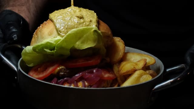 Doppio hamburger, cheddar, lattuga, pomodoro, cipolla caramellata, fonduta di pistacchio