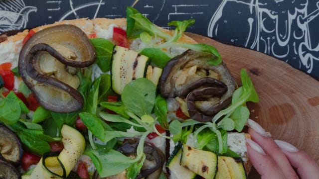 Hamburger di agnello, patate croccanti, verdure grigliate, insalata coleslaw, provola affumicata, salsa di basilico
