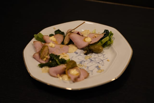 in porchetta con il suo fondo, accompagnata da lamponi,mela verde e misticanza