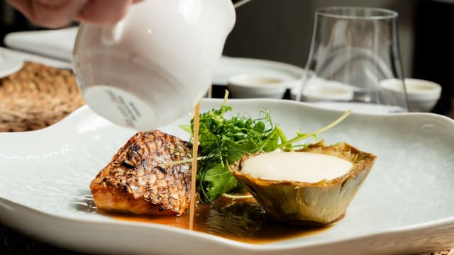 Triglia a portafoglio, finocchio arrostito, tapenade di olive nere pugliesi e zuppetta di triglia di scoglio