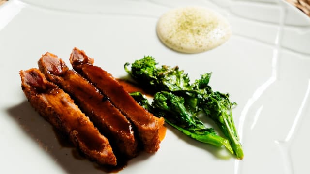 Guancialetto di suino iberico, purè di zucca butternut, crumble salato al rosmarino e biete erbette