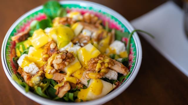 Mezcla de rúcula y canónigos, nueces, queso feta, manzana y pollo con salsa de mostaza y miel.