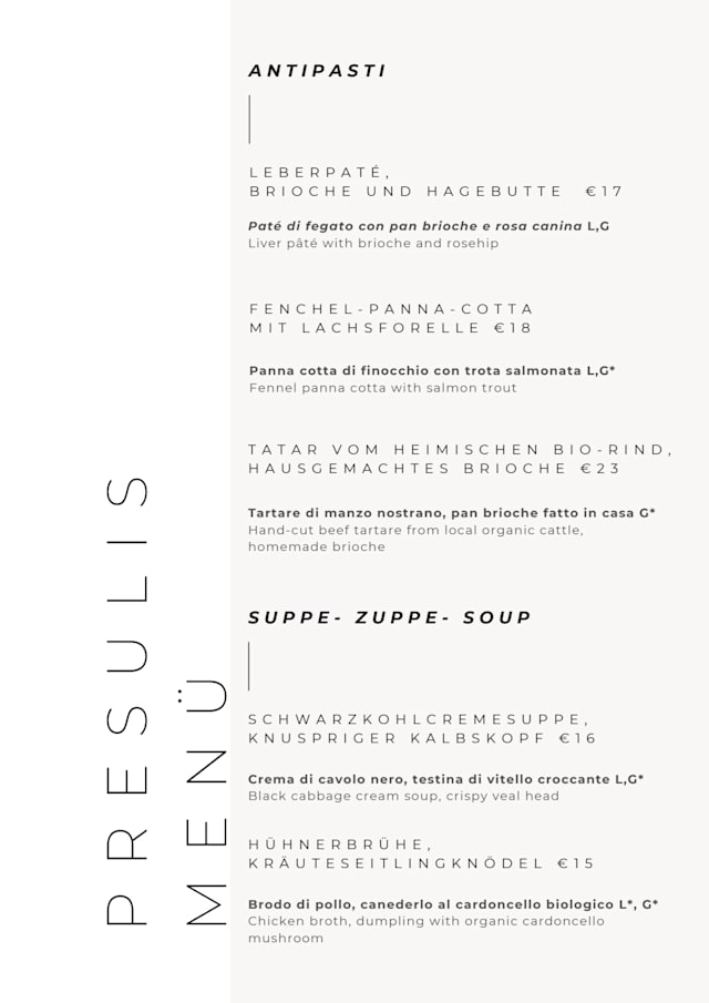 10/10+2Very nice setting, beautifull place with nice view towards a medieval castle. Very friendly personal. Nice and clean restaurant. 7 course menu with variable meals. Everything was both tastefull and smart looking. Excellent flavours, well combined together, presenting a nicely balanced cousine. Together with well chosen wine was this a experience that we can recommand to all that have been lucky to spend time in Süd-Tyrol. If you are around, do not hasitate to visit Presulis Lodge. Extra salut to the chef, that made the magic on our plates!