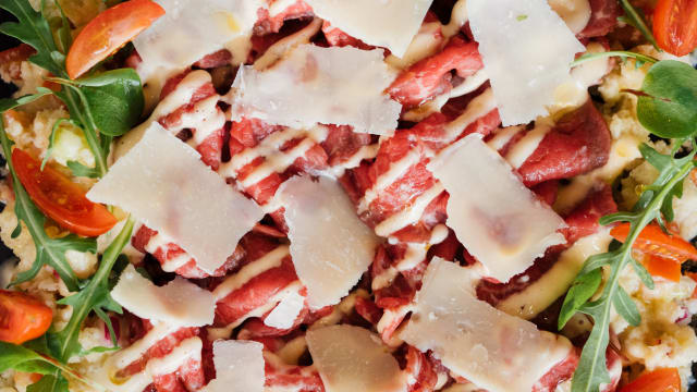Lombo de novilho, alcaparras, parmesão, rúcula e vinagrete.