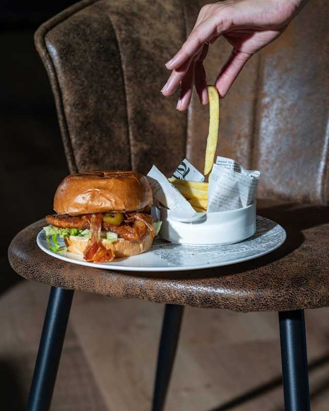 - Hamburger di manzo, insalata, pomodoro, bacon, cheddar, salsa della casa (serviti con pane fatto in casa e patate fritte)