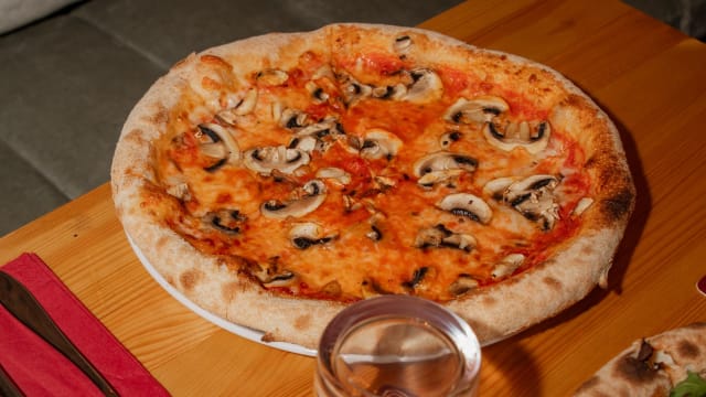 Molho de tomate, mozzarella, salame, pimentos, cogumelos, azeitonas pretas e ovo cozido fatiado