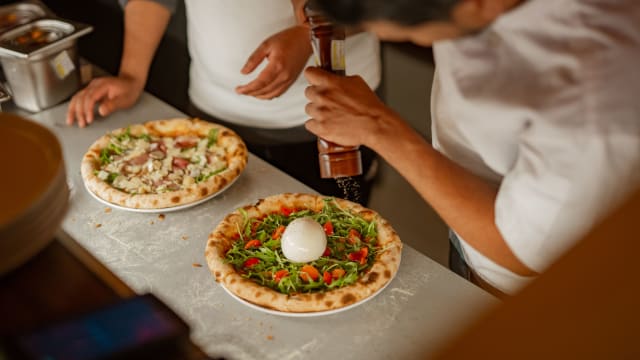 Molho de tomate, burrata e mozzarella, rúcula e tomates cherry temperados com sal e pimenta, finalizada com um fio de azeite