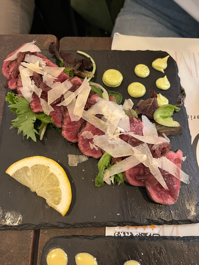 9/10Primo Urban Bistrot is a cozy, informal bistrot just steps from Trastevere Train Station - ideal for a relaxed couple’s night out. Attentive yet unobtrusive service sets the tone, while inventive meat sushi rolls, tender carpaccio and tataki, and a savory pork-lardo bruschetta showcase the kitchen’s creativity. Two glasses of Negroamaro paired perfectly, and the creamy tiramisù made for a delightful finale. Prices are fair, the atmosphere warm, and you can even pay with Yums points—making it a smart choice for both a casual date or a laid-back dinner with friends. Reservations recommended!