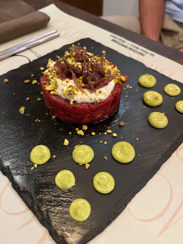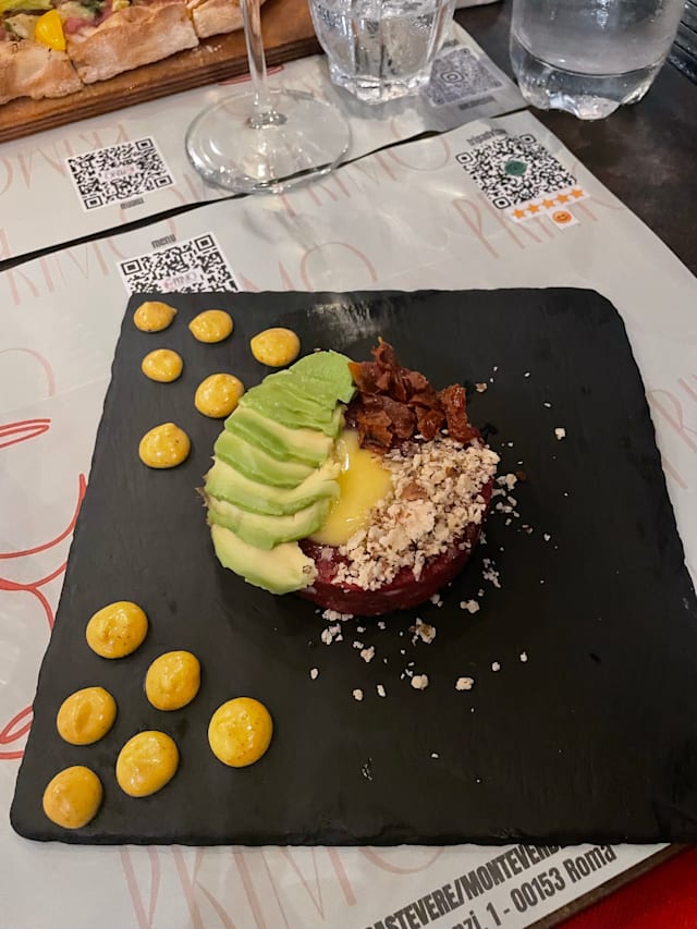 10/10Primo’s concept centers around crudi di scottona (raw beef cuts) and also pinsa romana crafted from organically sourced flours and a long, 72-hour fermentation which would be a reason to go back soon and try. The service offered by the two young gentlemen managing the small area inside was impeccable. Very professional and very knowledgable. It was my first time there and they suggested the best options to appreciate the food they prepare. Starting with the beef tartare and onto a beef carpaccio that was exquisite accompanied by a very well done focaccia. The wine recommend was also optimal. As for the dessert, nothing to complain. Definitely worth the price and will surely recommend and return. The space is limited and bookings are required especially on a rainy day (or very hot day) when sitting outside is not an option.