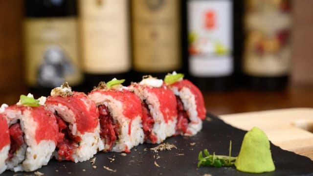 Interno: battuta di scottona, maionese allo zenzero, cetriolo. Esterno: carpaccio di scottona marinato, ciuffetti di zenzero, tobiko katsubushi, zest di lime