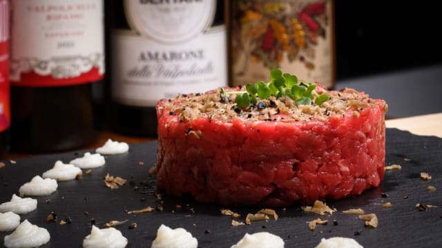 Interno: scottona, maionese al basilico. Esterno: carpaccio di scottona, crema al pecorino, tartufo