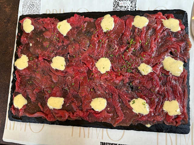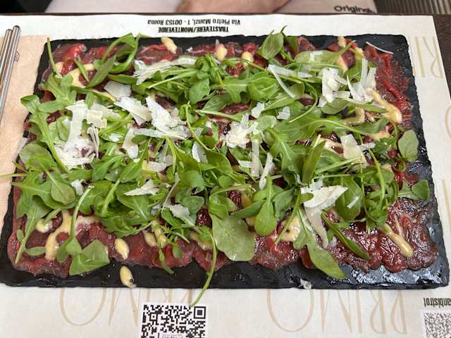 10/10Primo’s concept centers around crudi di scottona (raw beef cuts) and also pinsa romana crafted from organically sourced flours and a long, 72-hour fermentation which would be a reason to go back soon and try. The service offered by the two young gentlemen managing the small area inside was impeccable. Very professional and very knowledgable. It was my first time there and they suggested the best options to appreciate the food they prepare. Starting with the beef tartare and onto a beef carpaccio that was exquisite accompanied by a very well done focaccia. The wine recommend was also optimal. As for the dessert, nothing to complain. Definitely worth the price and will surely recommend and return. The space is limited and bookings are required especially on a rainy day (or very hot day) when sitting outside is not an option.