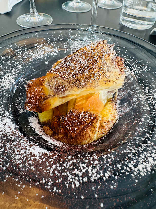 - Fiocco croccante di pesce sciabola, purè di sedano rapa e riduzione di sagrantino