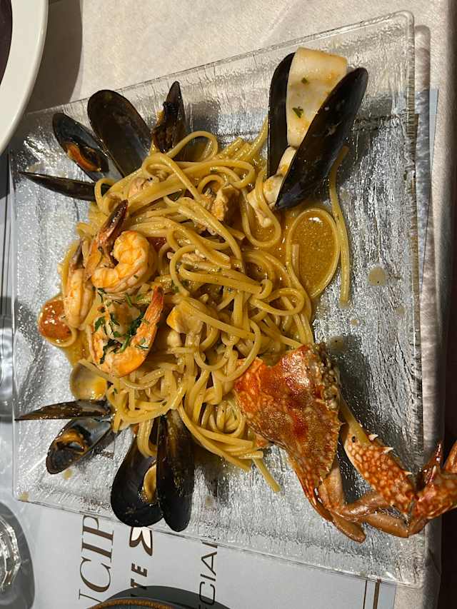 - Spaghetti principe del mare con vongole veraci, pomodorini, pesto di basilico e pinoli