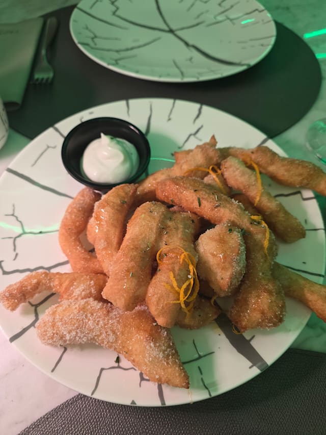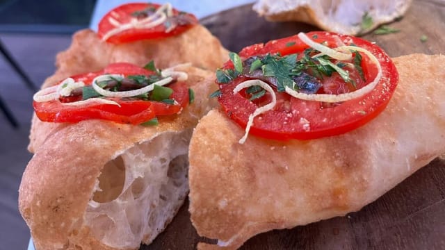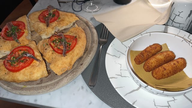 Trancio di pizza fritta con crema di grana padano DOP 12 mesi, acciughe di cetara, prezzemolo, peperoncino e zest di agrumi
