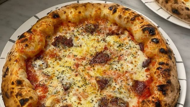 Fior di latte affumicato, pomodorino confit, salsiccia stagionata di suino casertano, origano del matese.