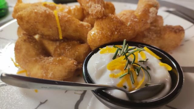 Straccetti con zucchero, cannella e miele, accompagnati con ricotta di bufala campana DOP aromatizzata alla vaniglia, rosmarino e zest d’arancia