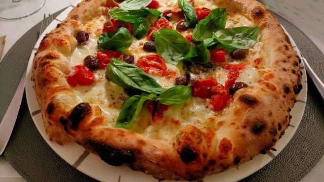 Mozzarella di bufala campana DOP, fiordilatte, piennolo del vesuvio DOP, olive nere, filetti di alici cetarii, origano, basilico, olio evo