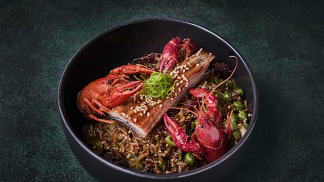 (Con anguila, cangrejo de río, langostinos y chorizo d