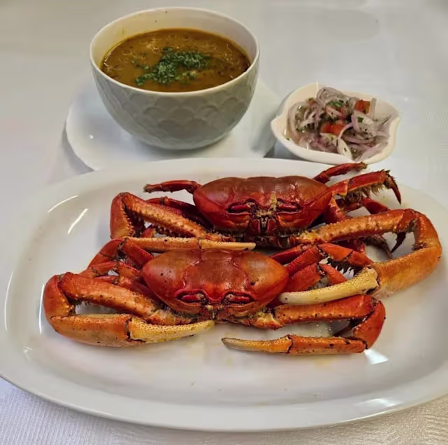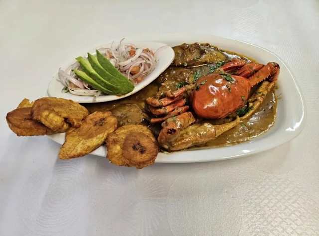 - Guatita, ceviche de camarón, ceviche de pescado, encebollado. Acompañado de maduro y aguacate.