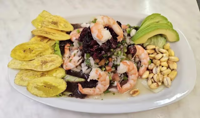 - Pescado fresco, camarón ecuatoriano cocido, curtido en jugo de limón, tomate, pepino, cebolla, salsa de maní y cilantro. Acompañado de chifles, tostado y aguacate.