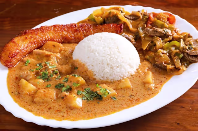 - Callos de ternera con maní y patatas. Acompañada con arroz y maduro.