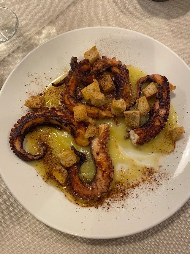 Polpo in doppia cottura su crema di patate, polvere di pomodoro secco e crostini di pane croccanti