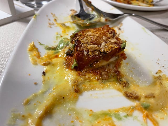 Parmigiana di melanzane su crema di datterino giallo, pesto di basilico e croccante di tarallo ai 5 cereali