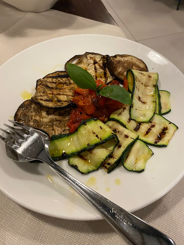 Cappello ripieno di melanzane e provola su crema di zucchine con stracciatella e mandorle tostate