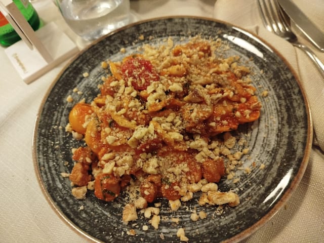 Strascinate integrali con salsiccia zampina, datterino giallo e rosso e noci croccanti