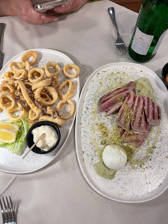 Tagliata di tonno su pesto di pistacchio, la sua granella e burratina pugliese