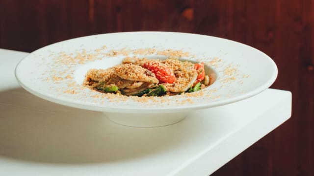 Tortelloni rossi ripieni di crostacei su crema di melanzane e mentuccia con pesce spada e fiore di zucca pastellato