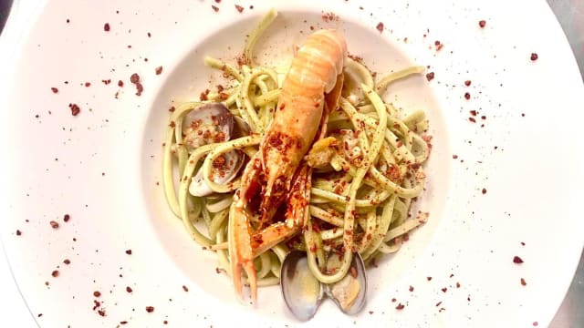 Tagliolini al basilico su bisque di crostacei con vongole, gamberi e lime grattuggiato